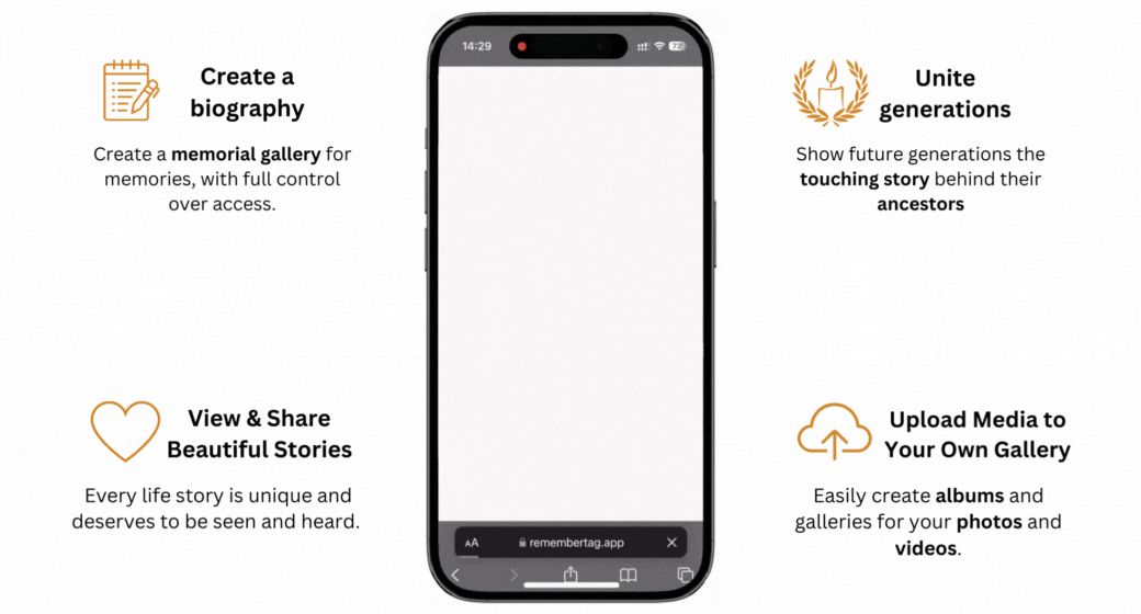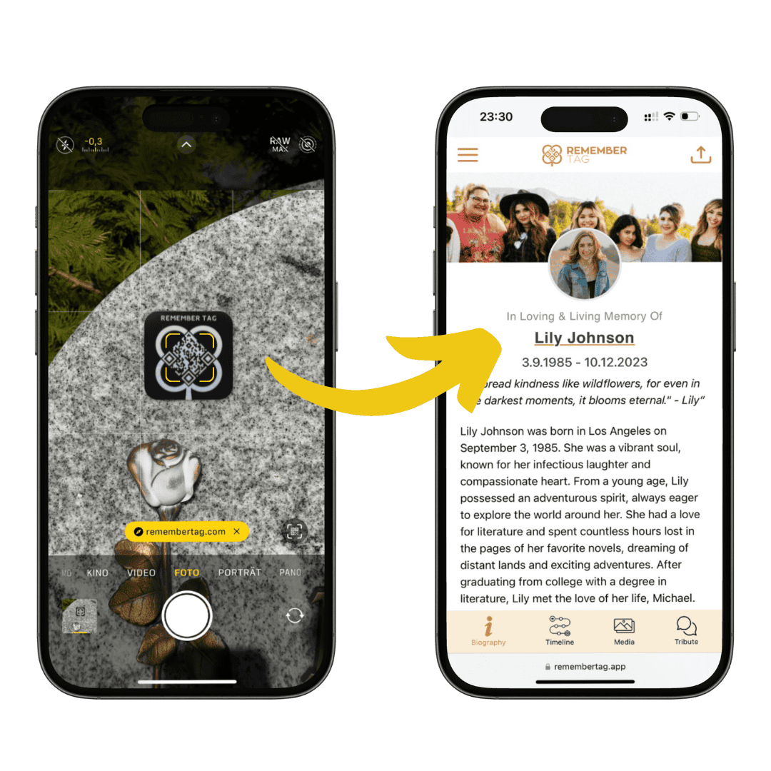 RememberTag ist ein QR-Code, der zu einem Profil auf unserer Gedenkplattform führt, wo du Fotos, Videos und den Zeitstrahl deines geliebten Menschen speichern kannst.